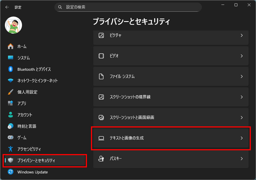 左メニュー「プライバシーとセキュリティ」を選択し、右側の「テキストと画像の生成」を選択します。