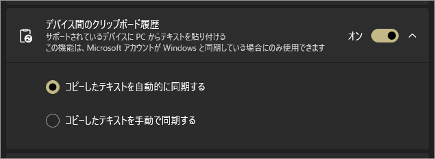 有効にするには、「デバイス間のクリップボード履歴」をオンにします。