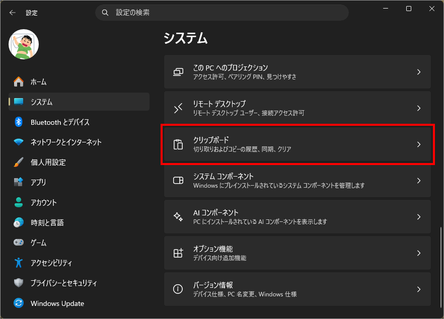 左メニュー「システム」を選択し、右側の「クリップボード」を選択します。