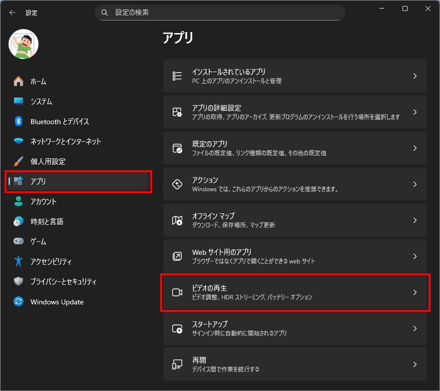 左メニュー「アプリ」を選択し、右側の「ビデオの再生」を選択します。