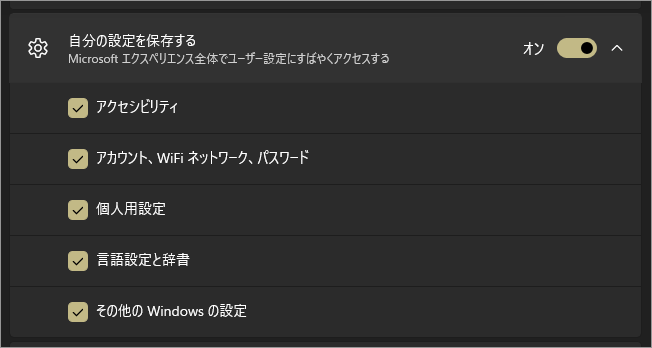 オンにすると、文字サイズやコントラスト、ナレーターなどのアクセシビリティ関連設定がアカウントに保存されます。別のPCでも、視認性や操作性を配慮した設定を引き継げます。