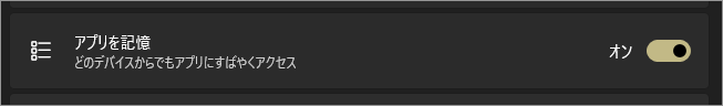 この設定をオンにすると、Microsoft Store アプリを中心に、使用していたアプリの情報を Microsoft アカウントに記憶します。新しいPCでサインインした際、以前使っていたアプリを再インストールしやすくするための機能です。ただし、アプリの設定や状態まで完全に復元するものではありません。