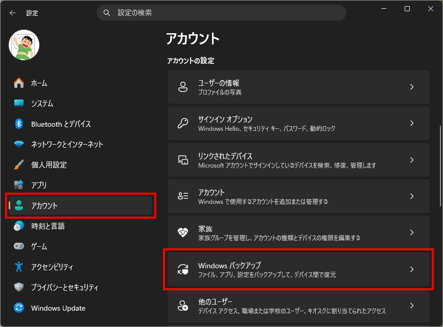 左メニュー「アカウント」を選択し、右側の「Windows バックアップ」を選択します。