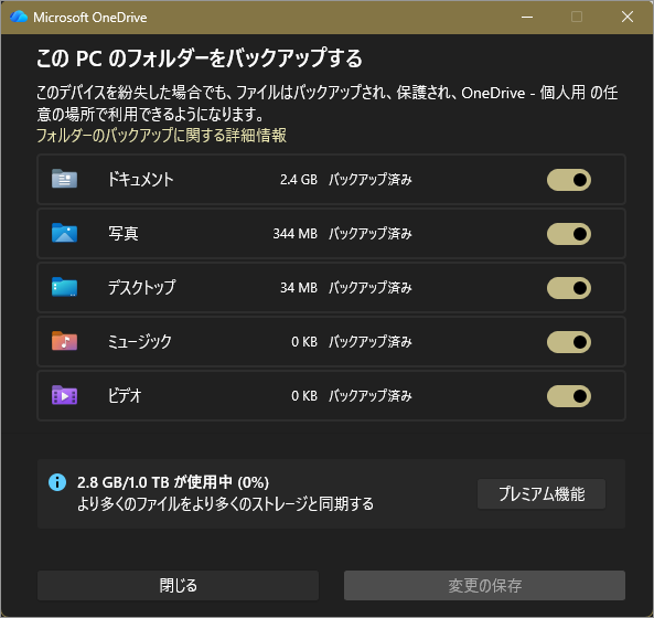 ここは、PC内の主要フォルダーをOneDriveにバックアップ(同期)するか選択する設定画面です。