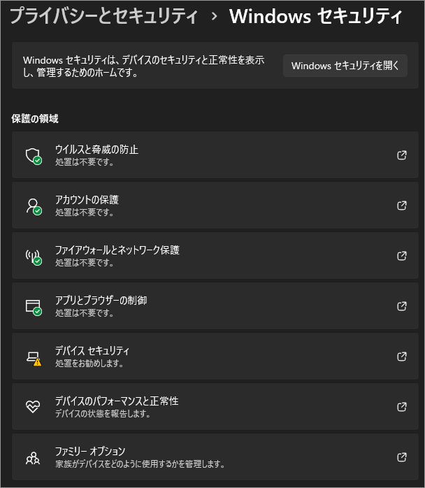 ウイルス対策、ファイアウォール、アプリの安全性チェック、デバイスのセキュリティ(コア分離・メモリ整合性)など、OS の深い層に関わる保護機能を確認・操作できます。