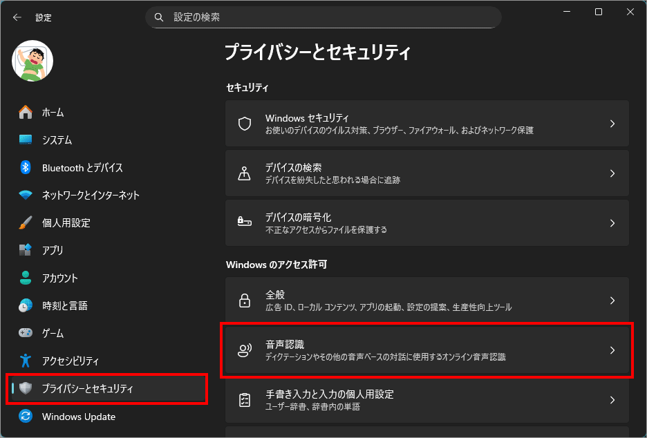 左メニュー「プライバシーとセキュリティ」を選択し、右側の「音声認識」を選択します。